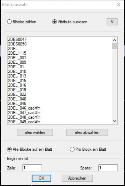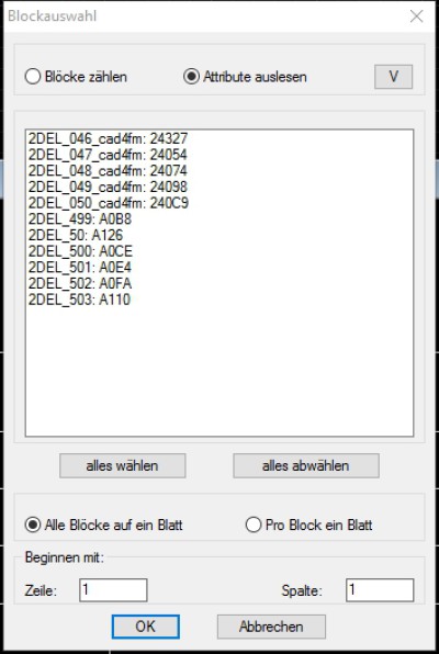 - Auslesen von Attributwerten aus auswählbaren Blöcken und exportieren in eine Excel Datei. Einschließlich konstanter Attribute